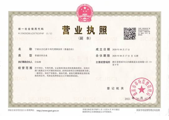 浙江億新知識(shí)產(chǎn)權(quán)服務(wù)有限公司前身為慈溪眾合知識(shí)產(chǎn)權(quán)代理事務(wù)所,創(chuàng)始于2004年,為了服務(wù)更多的創(chuàng)新企業(yè),實(shí)現(xiàn)“服務(wù)億萬創(chuàng)新企業(yè)”的理念,后更名為浙江億新知識(shí)產(chǎn)權(quán),旗下公司包括:寧波眾合億新專利代理事務(wù)所(機(jī)構(gòu)代碼33405)、中范(北京)認(rèn)證有限公司。其中寧波眾合億新專利代理事務(wù)所是慈溪市科技服務(wù)聯(lián)盟理事單位,前灣區(qū)知識(shí)產(chǎn)權(quán)工作站。公司位于浙江省慈溪市文化商務(wù)區(qū)友誼商廈,并在北京、青島設(shè)有辦事處。